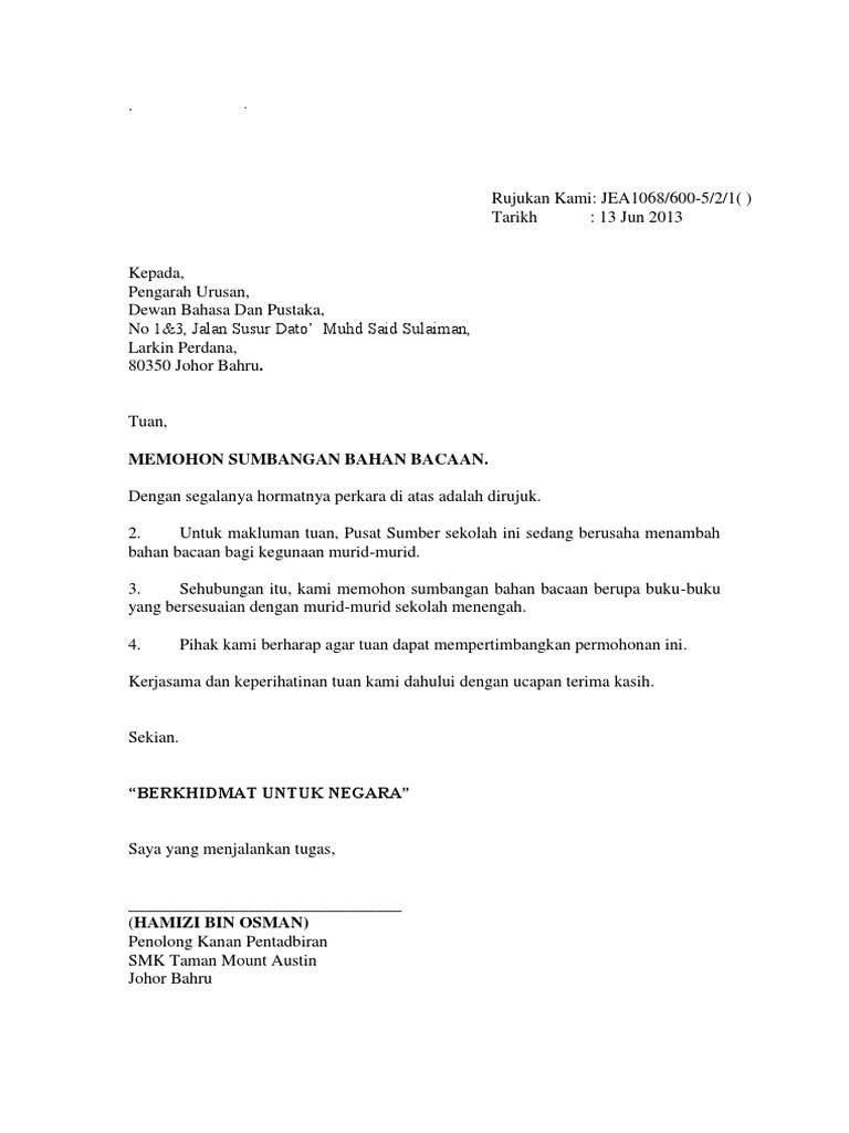 Atas perhatian dan kerjasamanya. Contoh Surat Rasmi Memohon Sumbangan Kewangan Surat rasmi mohon peruntukan dan.